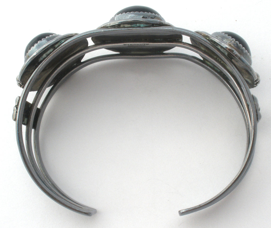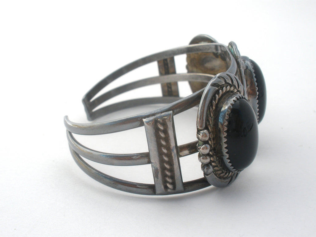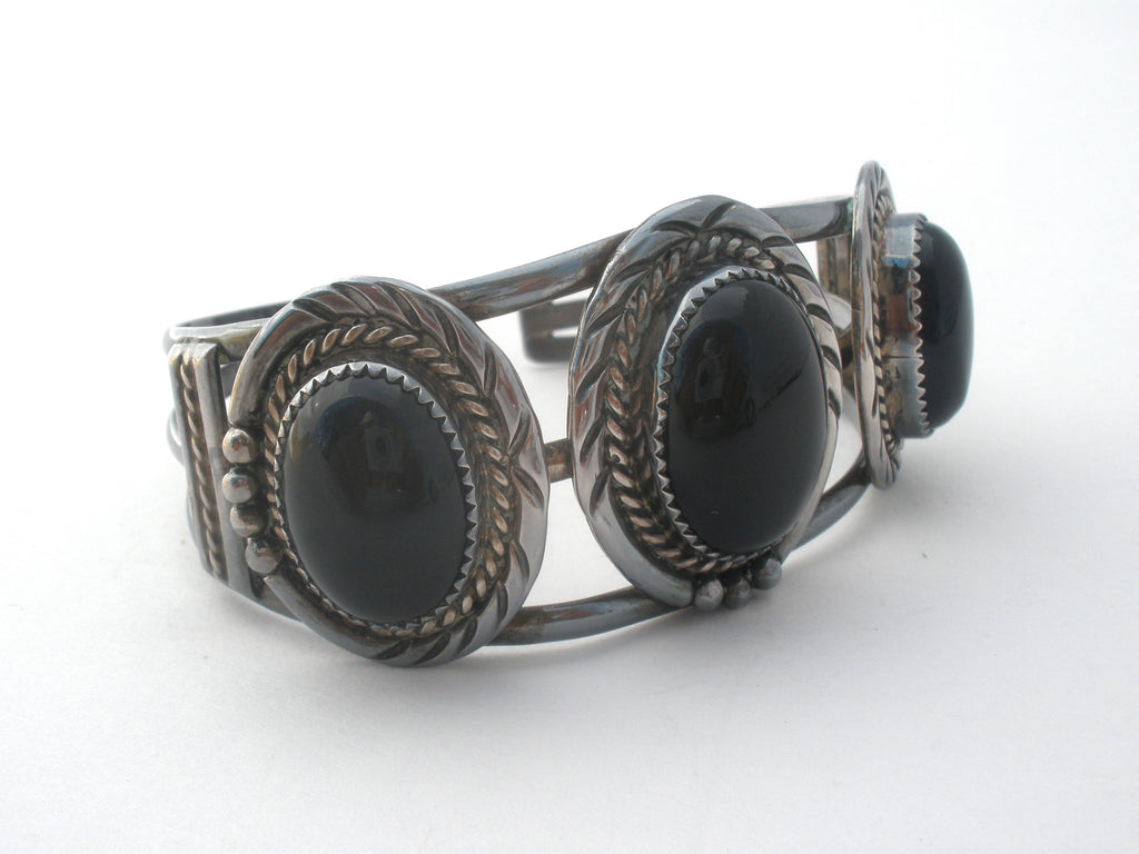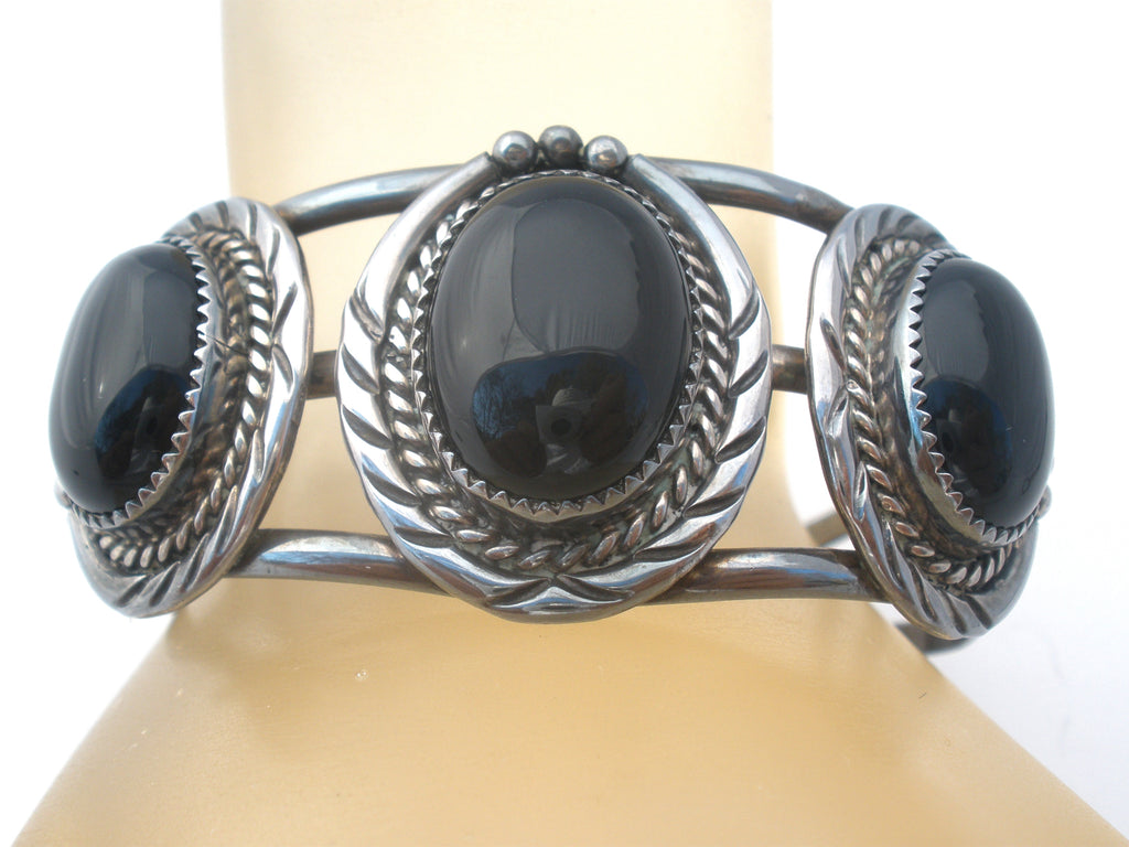 Native American Jewelry - This is a wide sterling silver cuff bracelet with 3 black onyx gemstones.