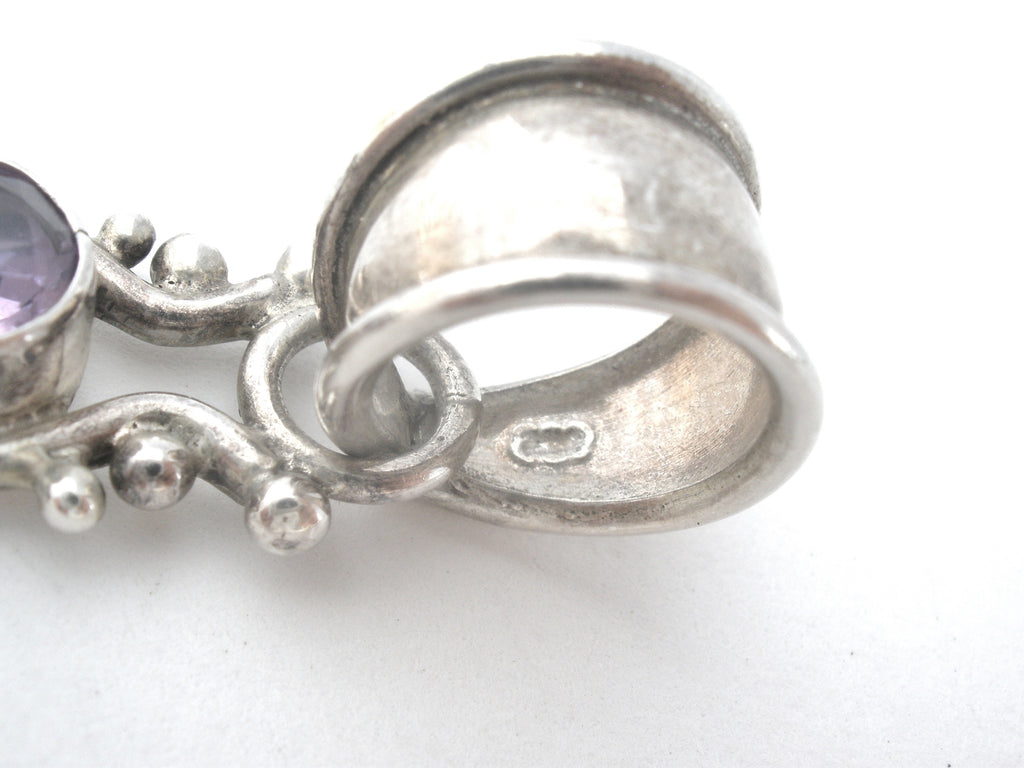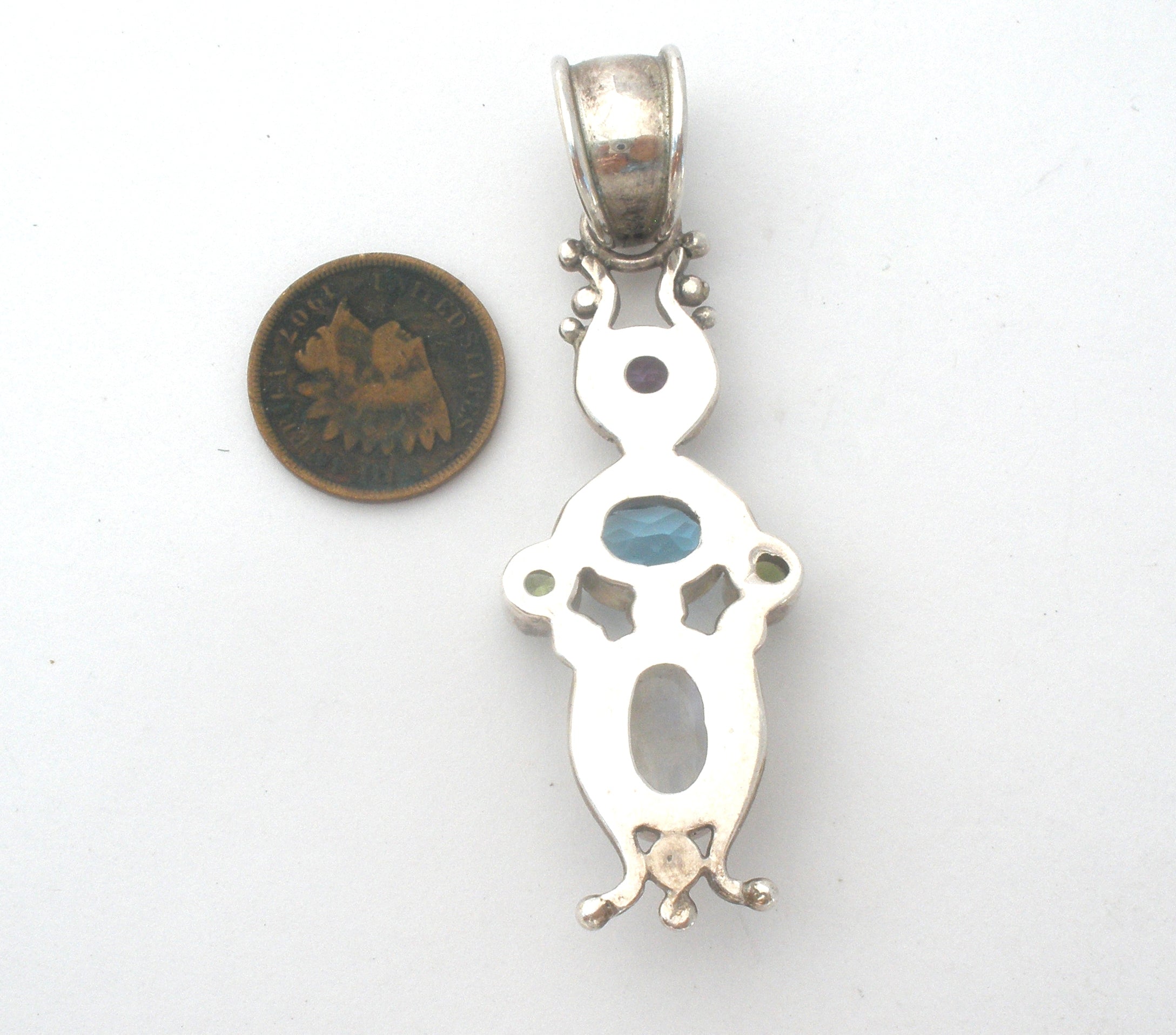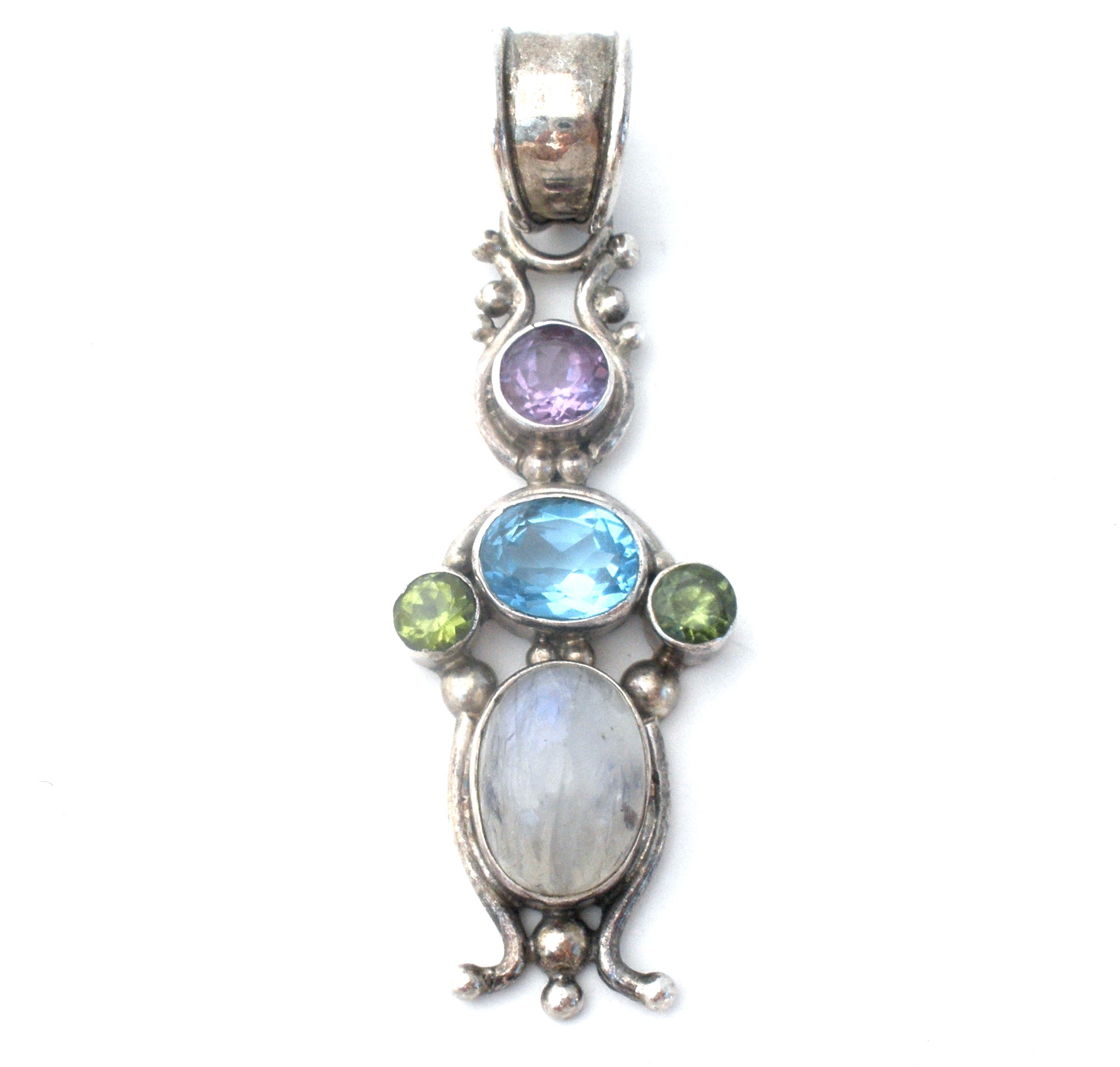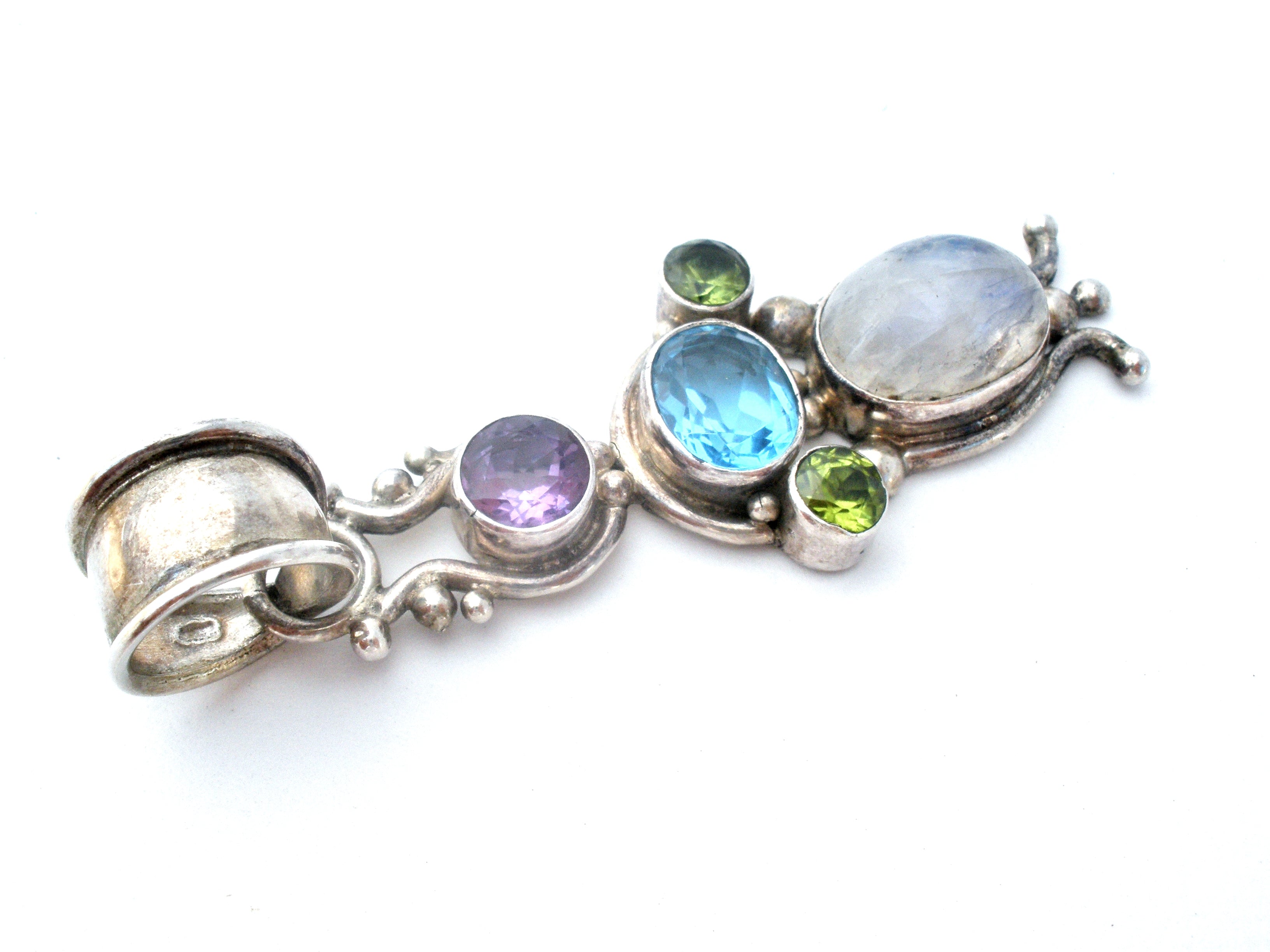 Fine Jewelry - This is a sterling silver necklace pendant with gemstones of blue topaz, peridot, amethyst and moonstone.