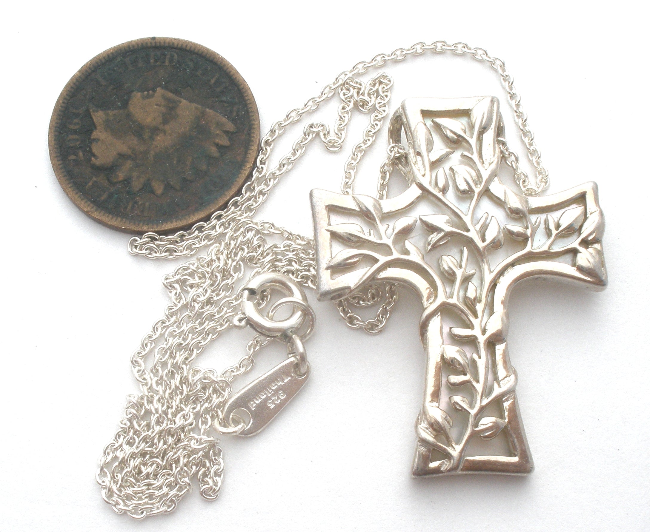 Designer Jewelry - This is a sterling silver cross pendant necklace with mother of pearl and a leaf design.