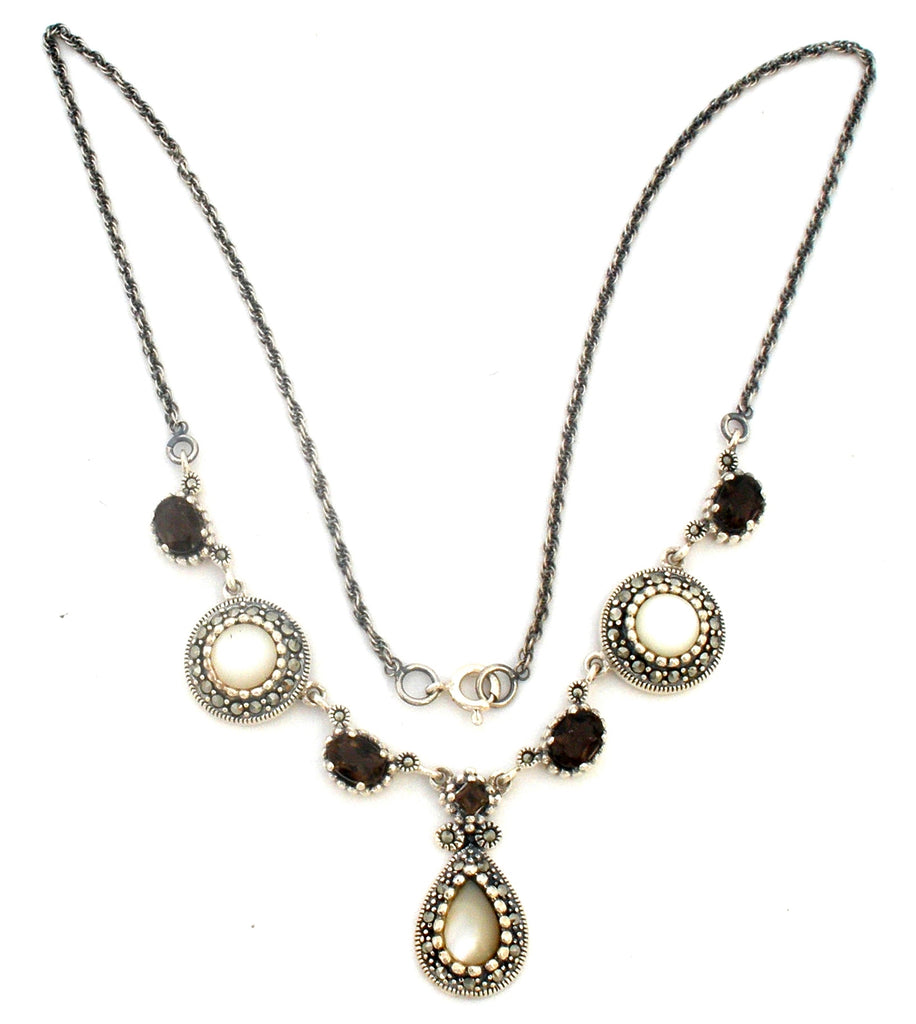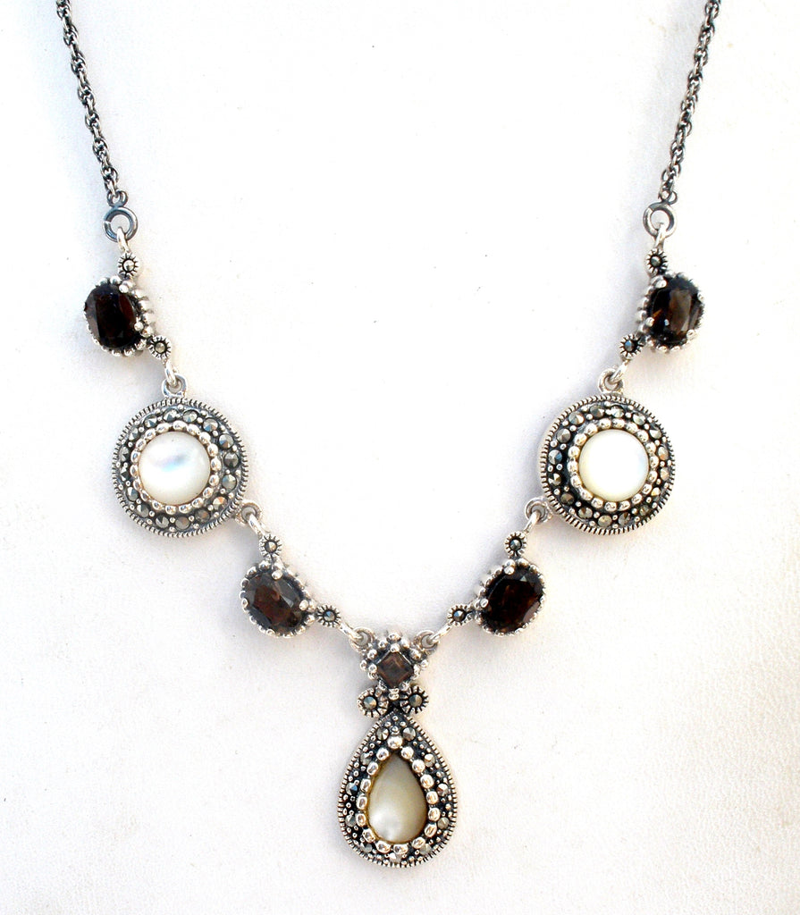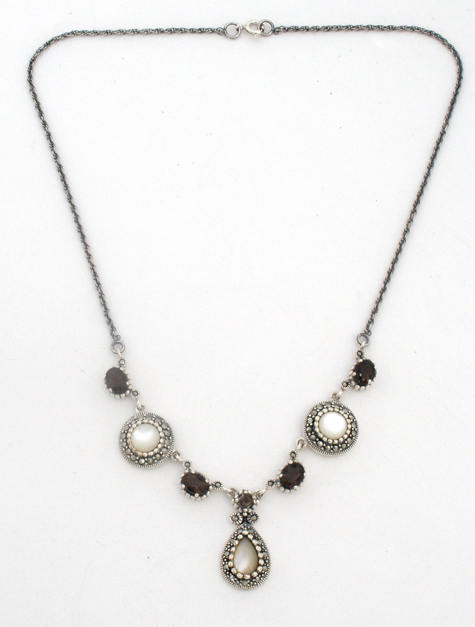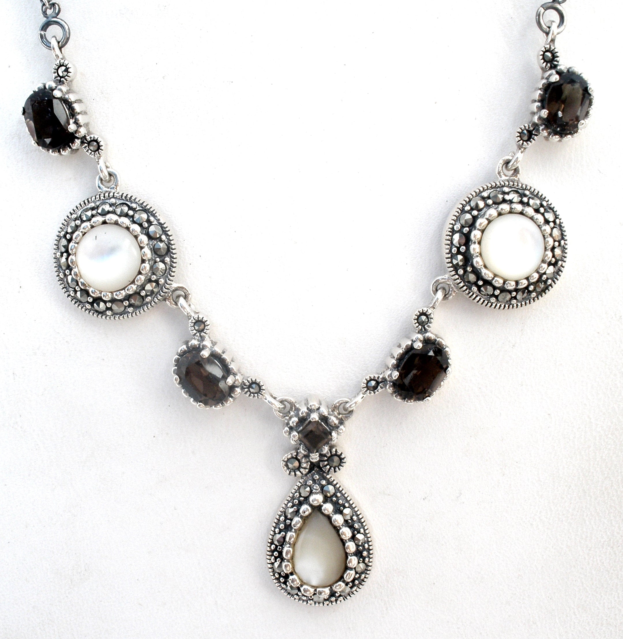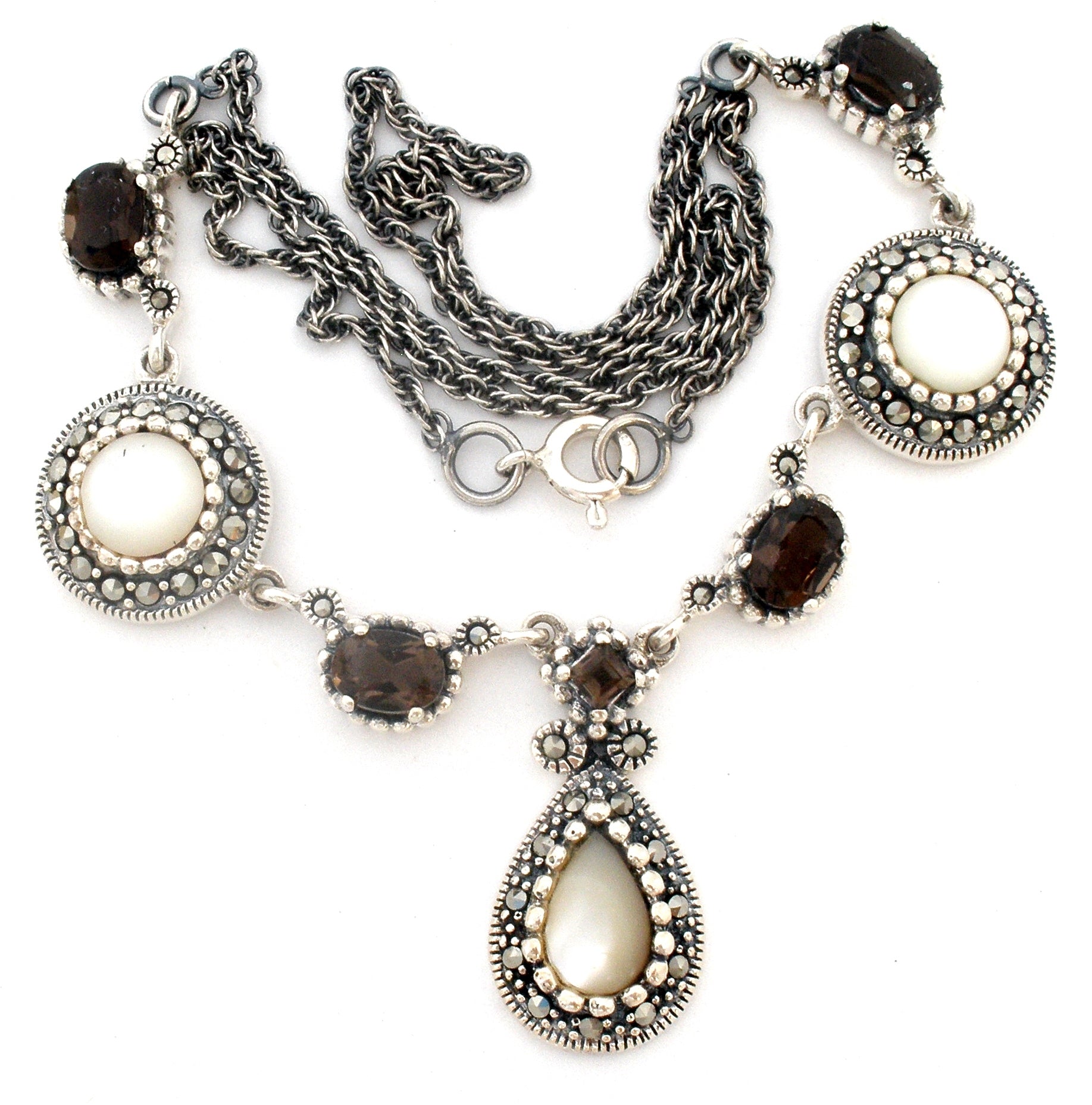Gemstone Jewelry - This is a sterling silver lavalier style necklace with mother of pearl, smoky topaz and accented with marcasites.