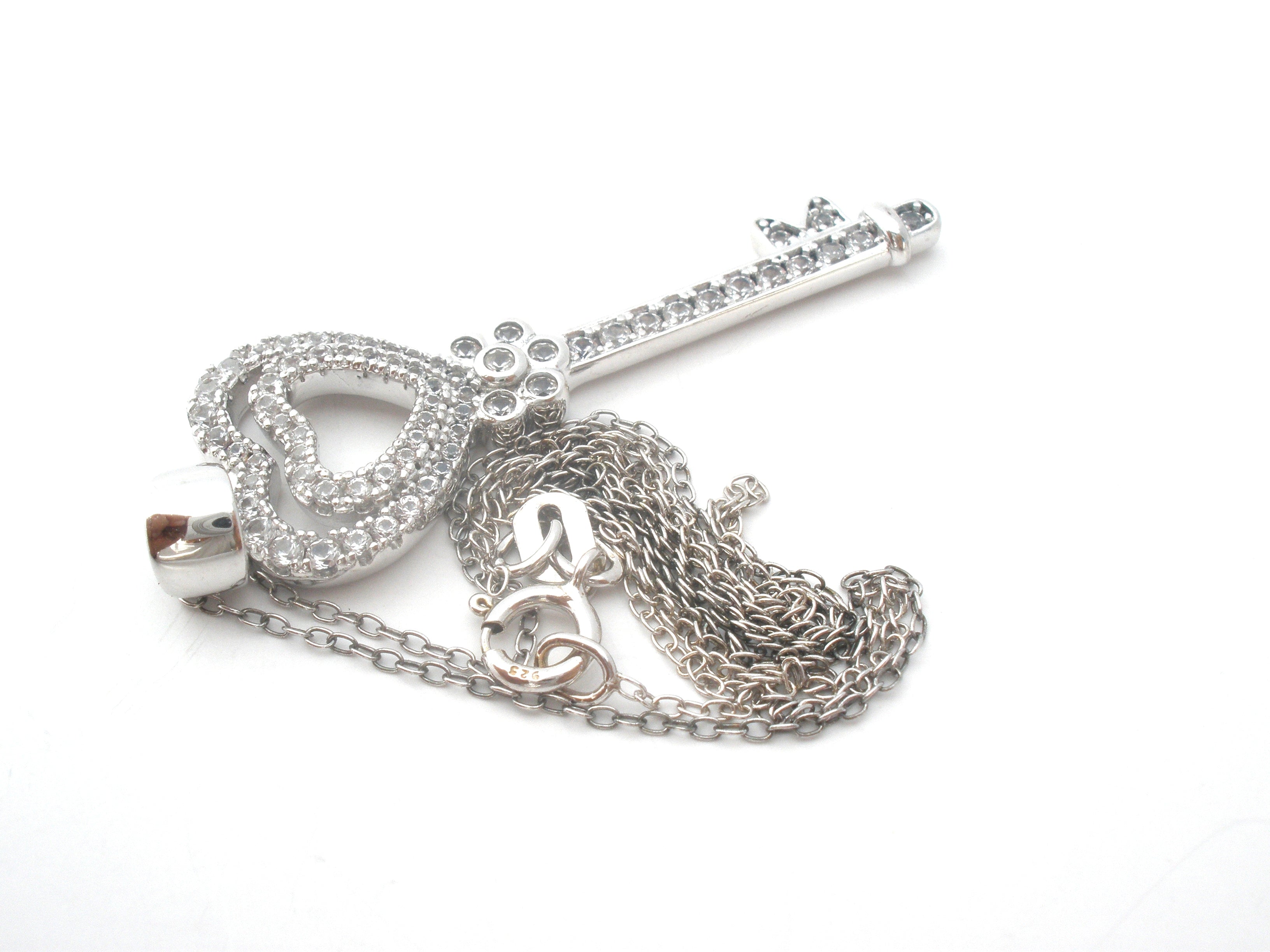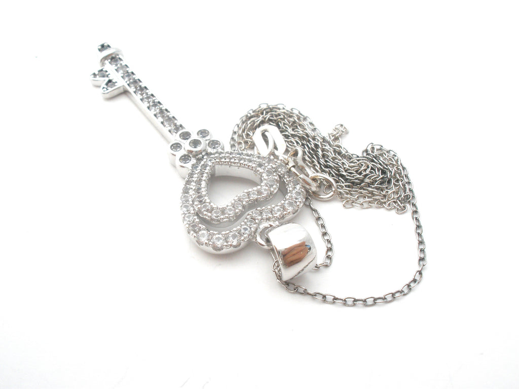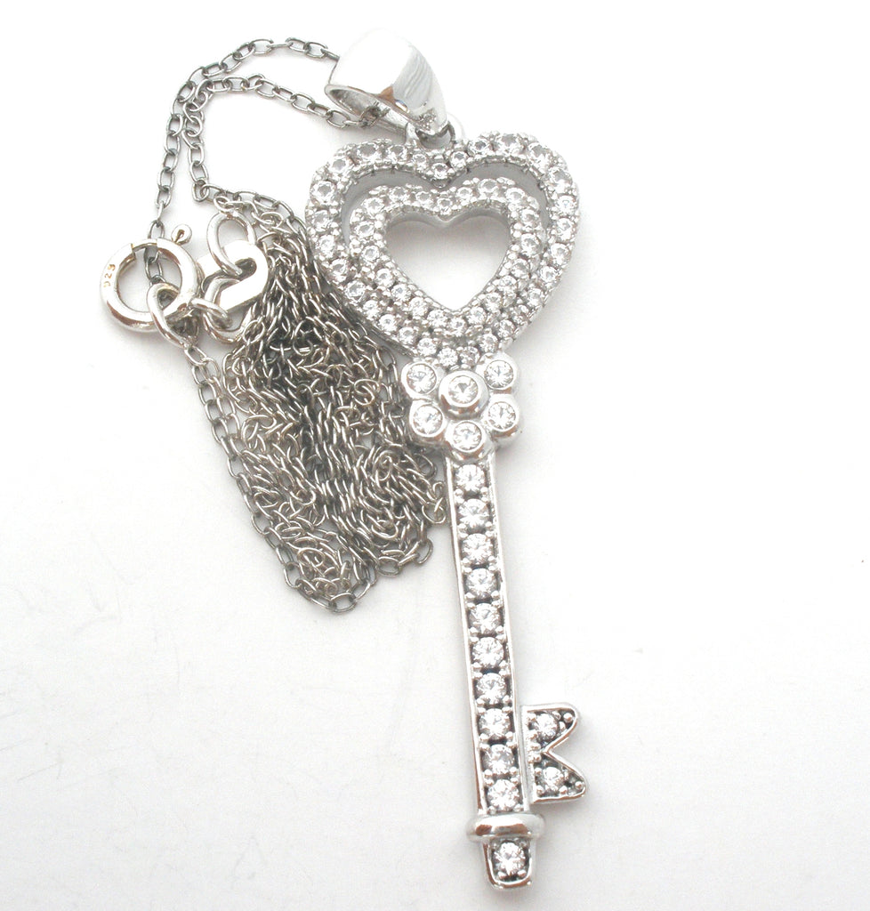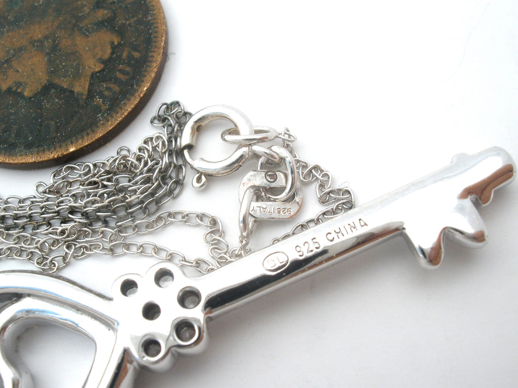The key has channel set clear cubic zirconias and measures 1.75" (includes the bail) and .5" wide, weight is 4.27 grams.