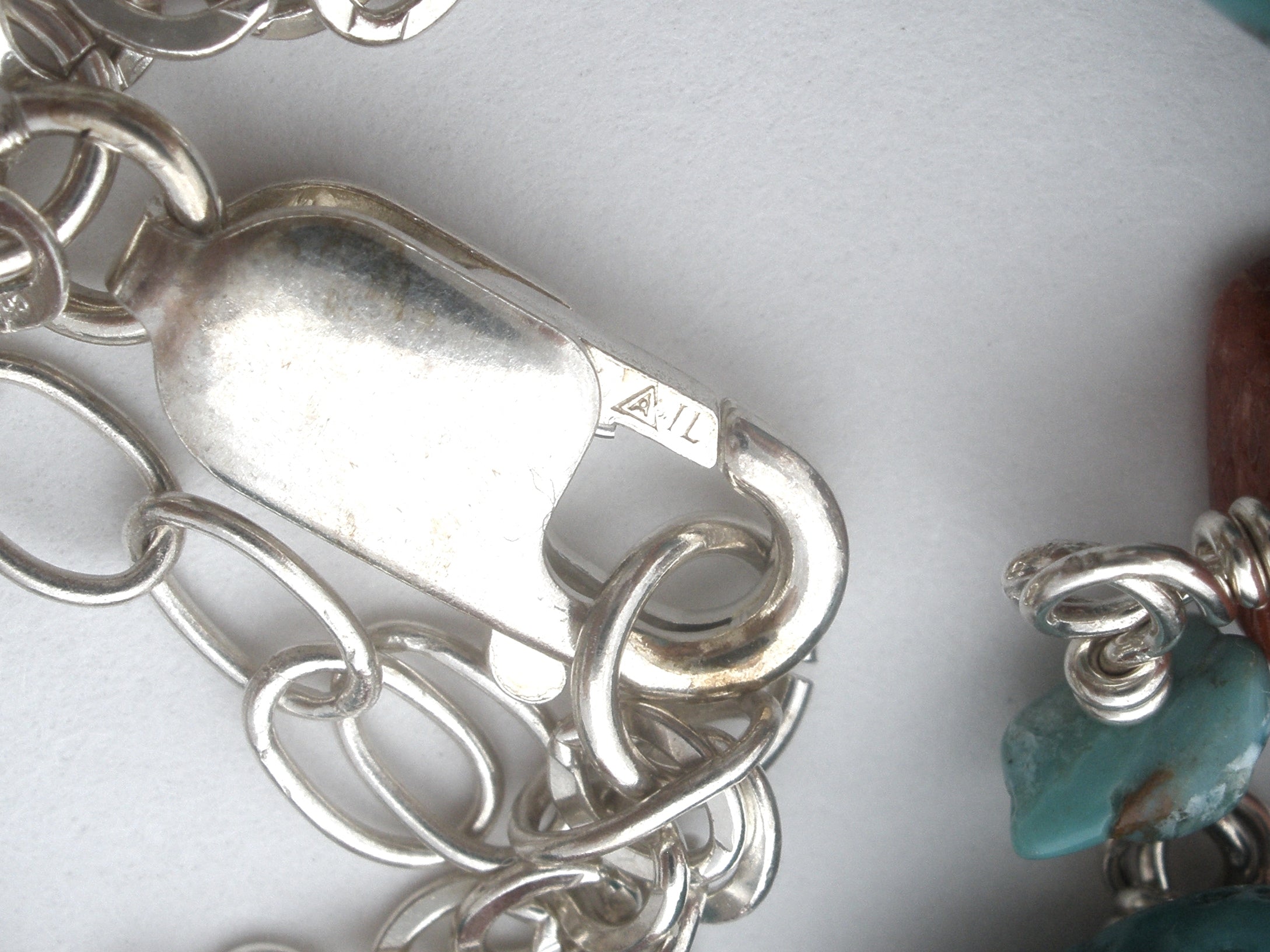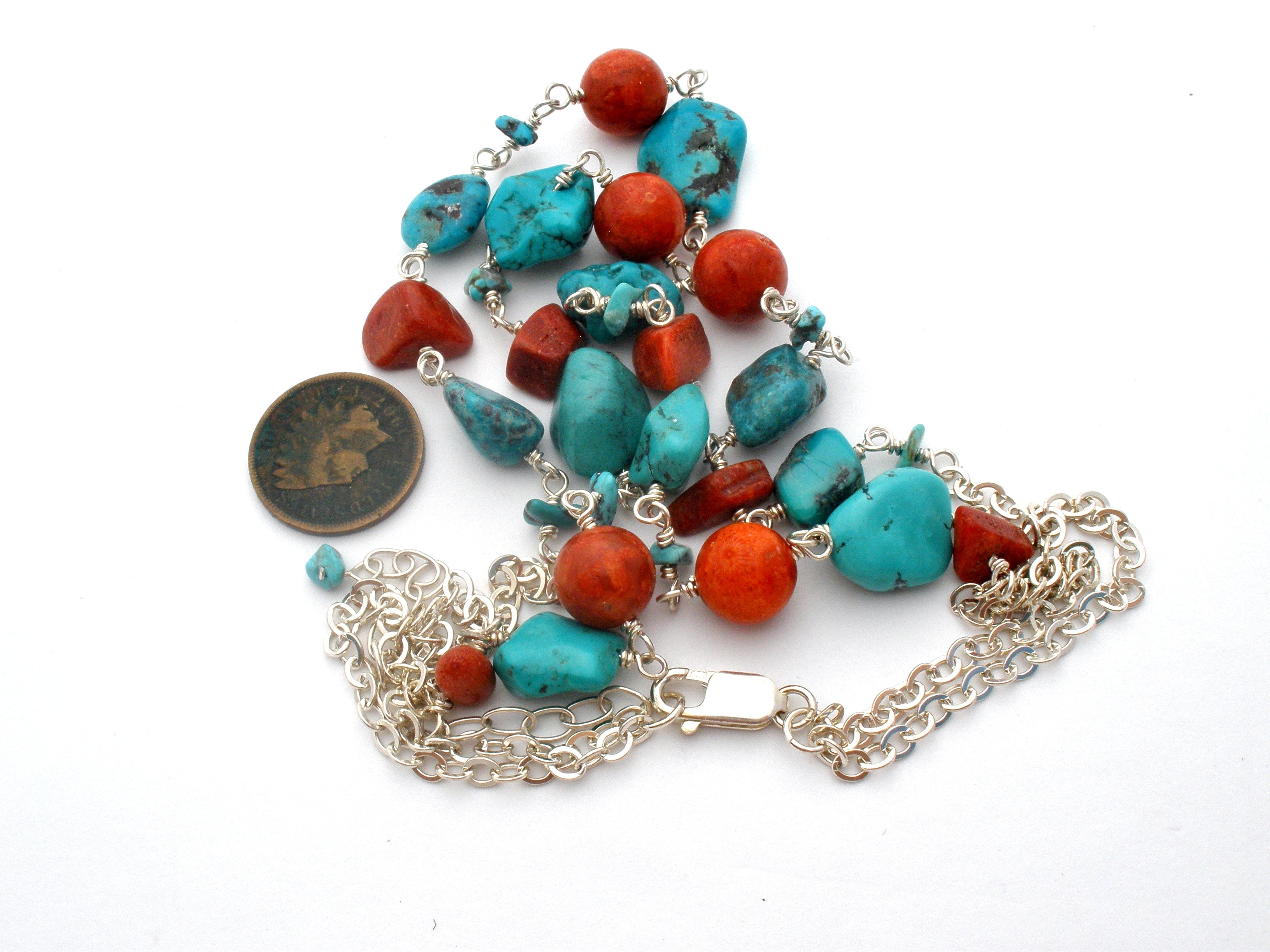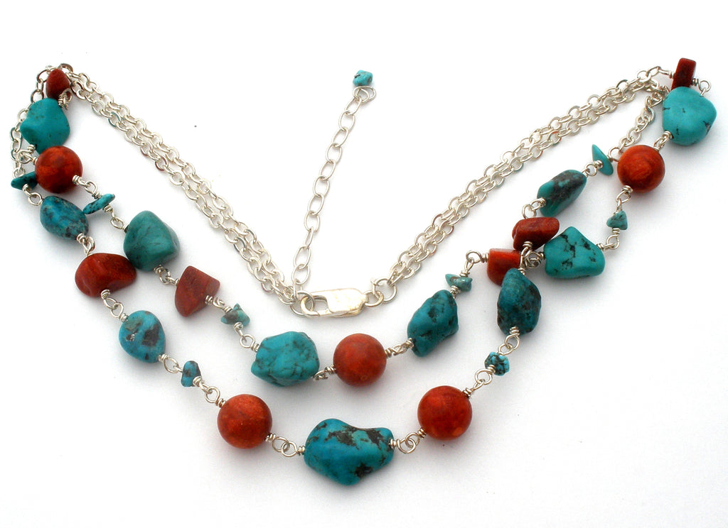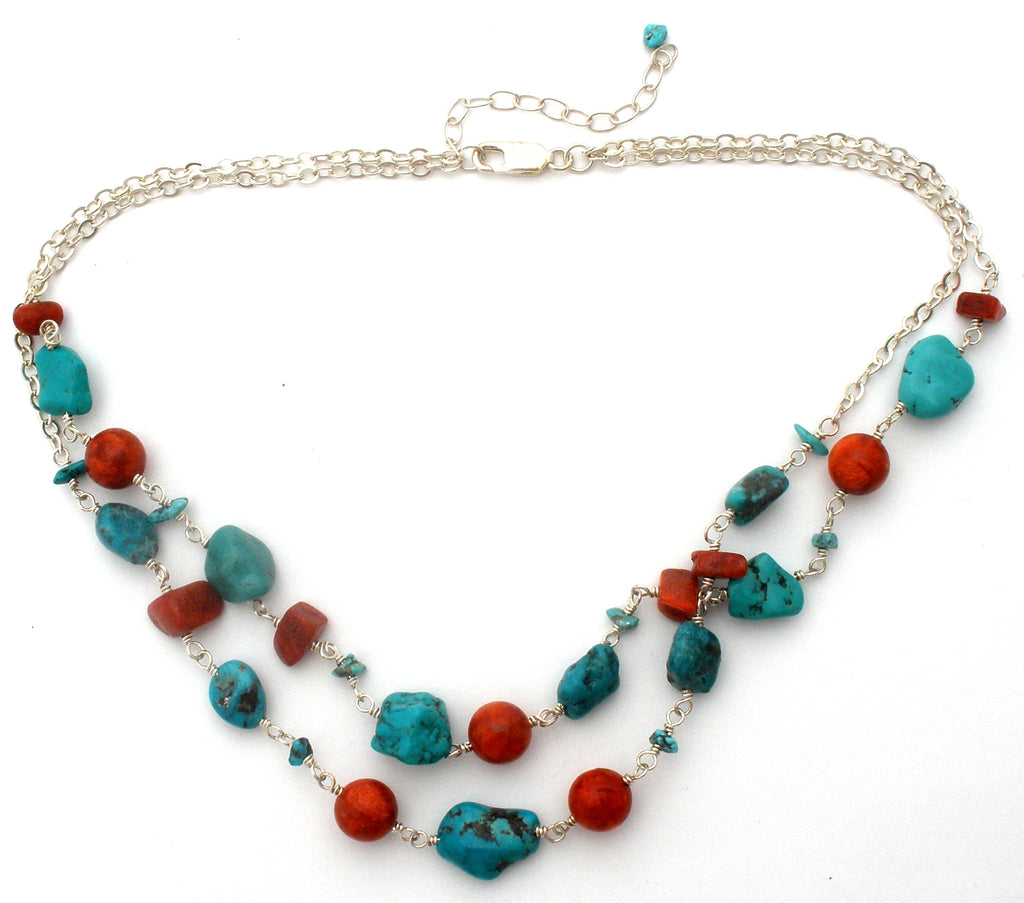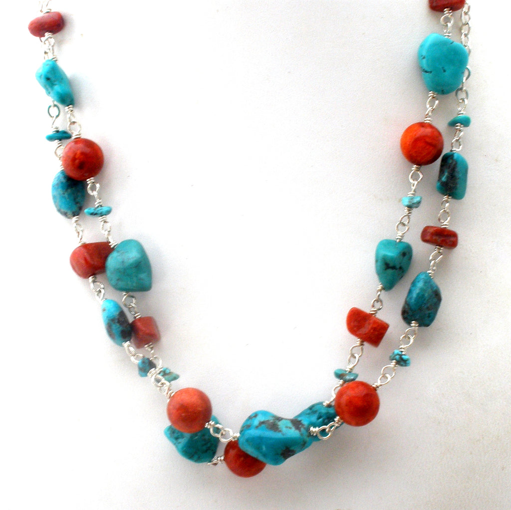 Southwestern Jewelry - This is a sterling silver double strand link chain with round and nugget shape blue turquoise and coral beads.
