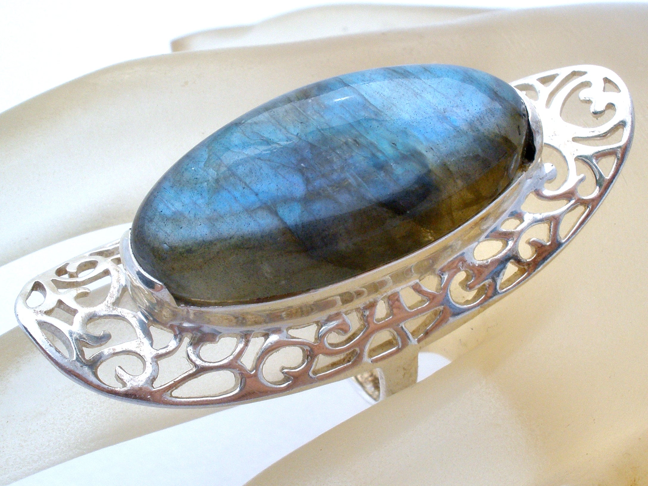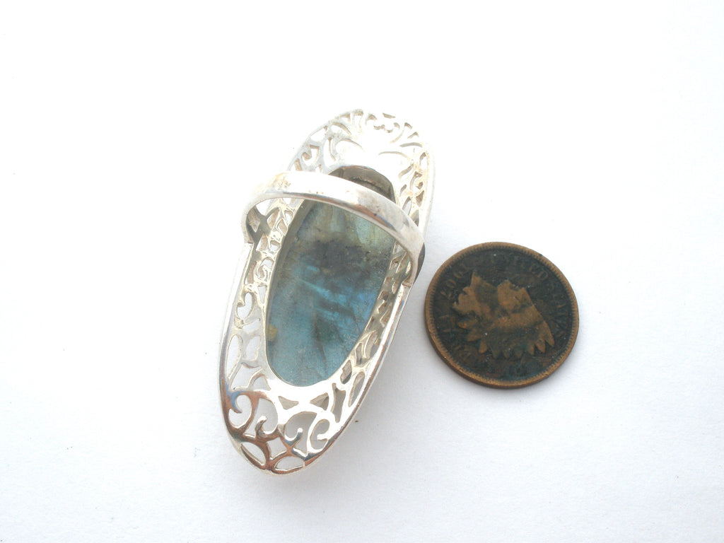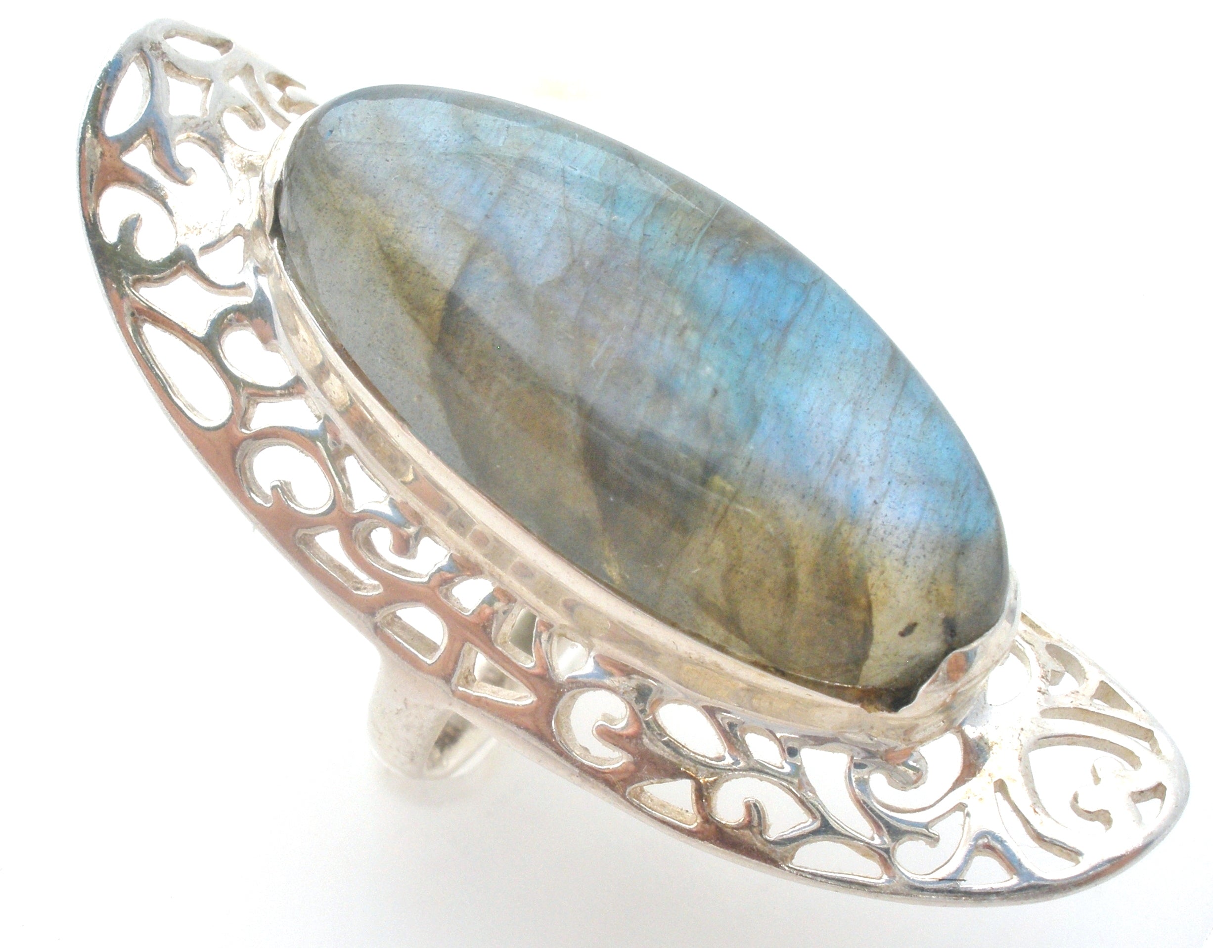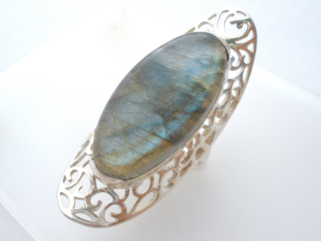Statement Jewelry - This is a sterling silver ring with a large oval labradorite gemstones surrounded with an open work design.
