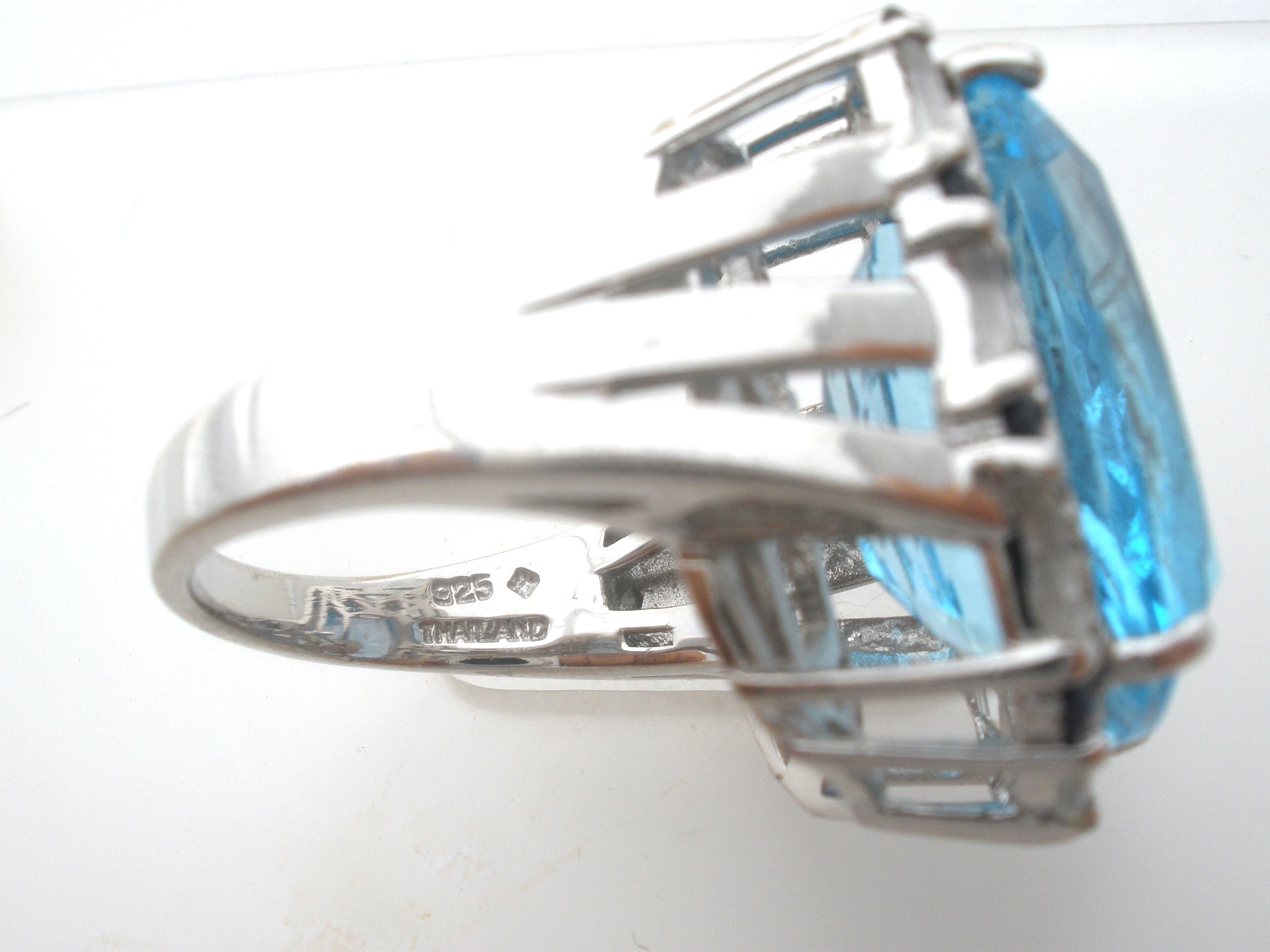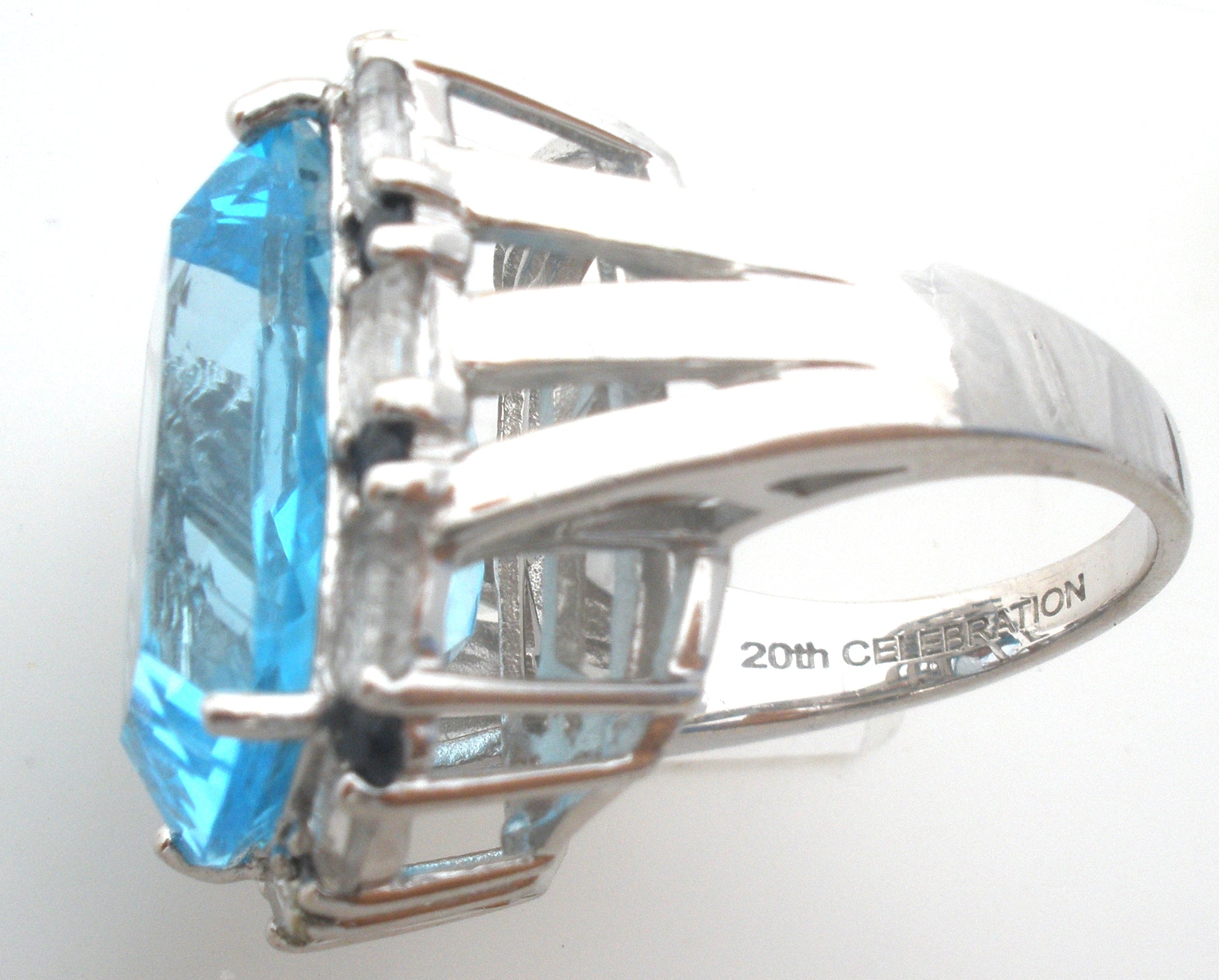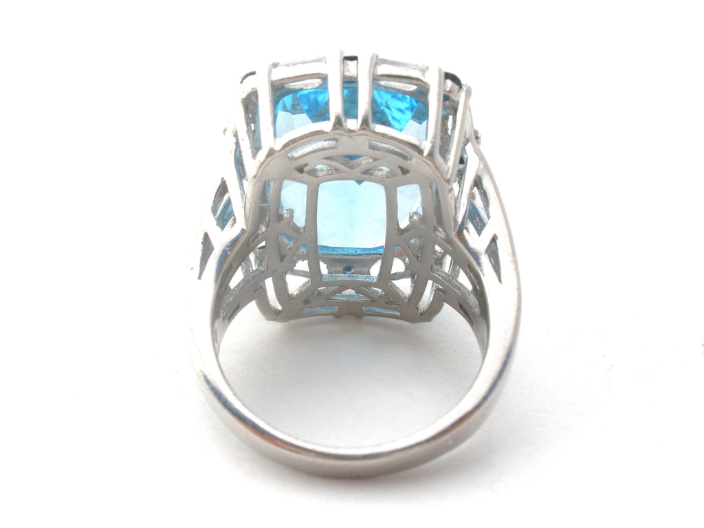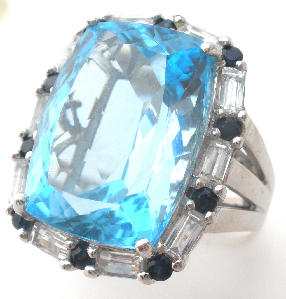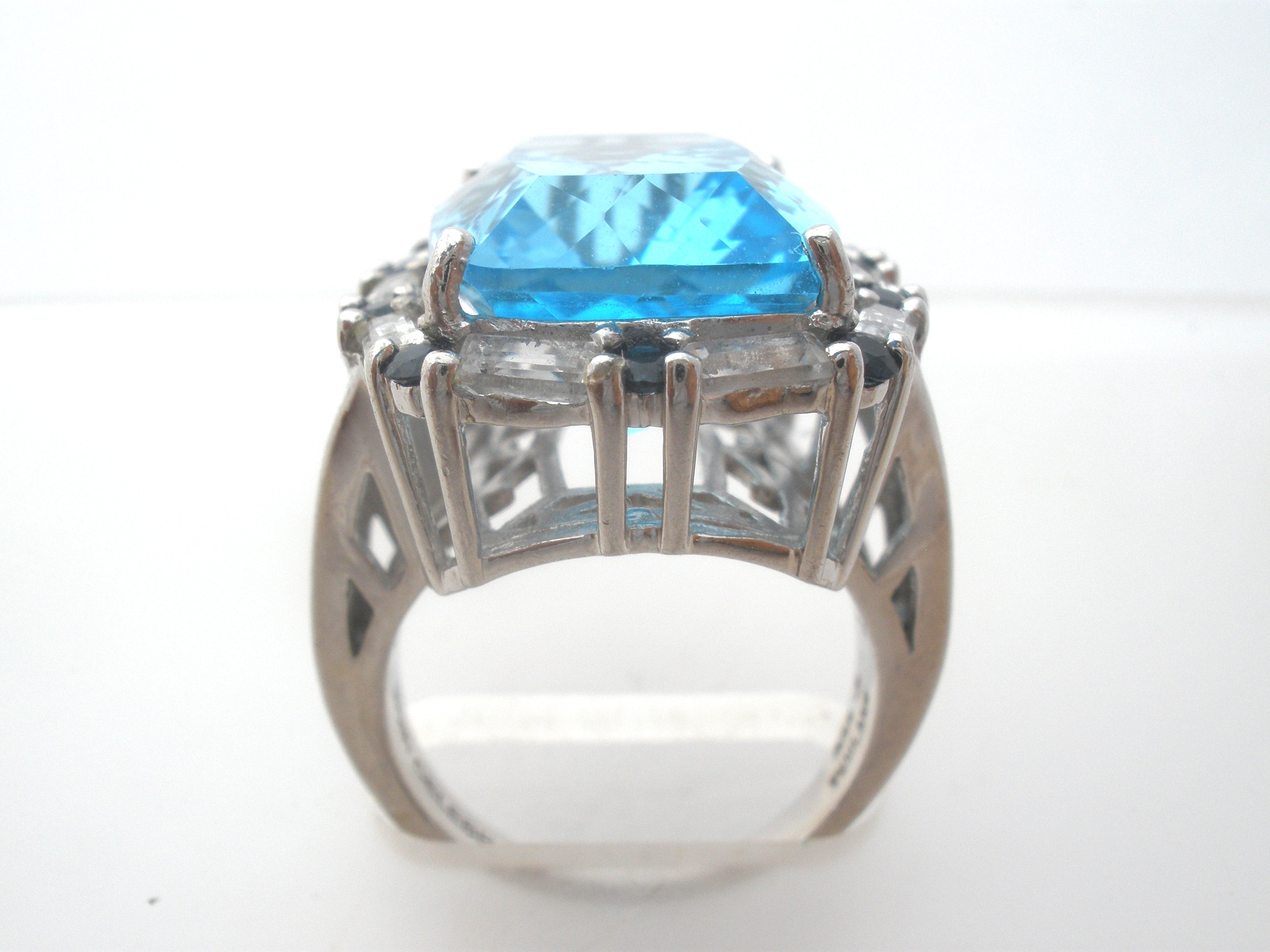 Fine Jewelry - This is a sterling silver ring with a large 15 carat cushion cut blue topaz gemstone surrounded by dark blue and clear sapphires.