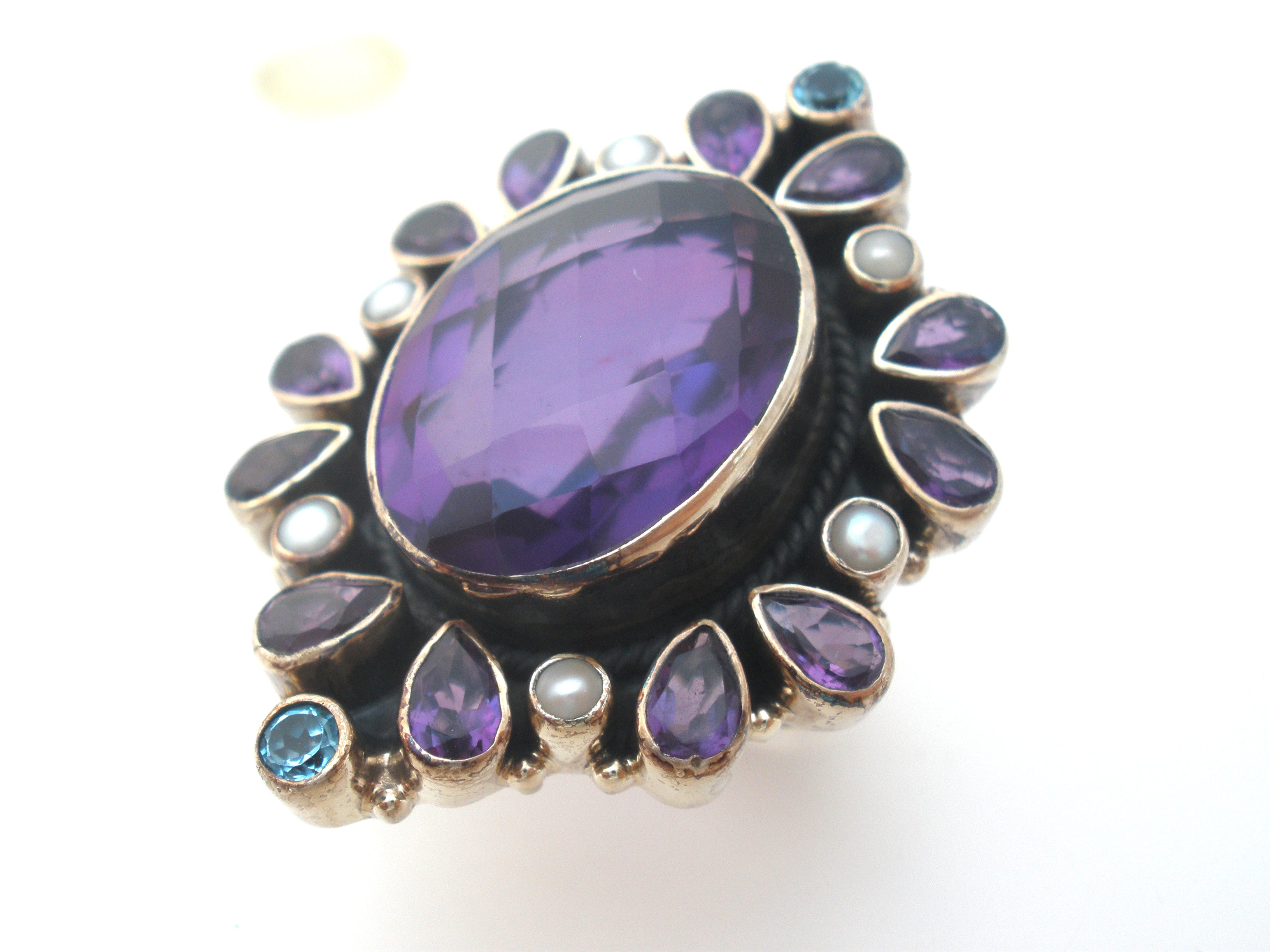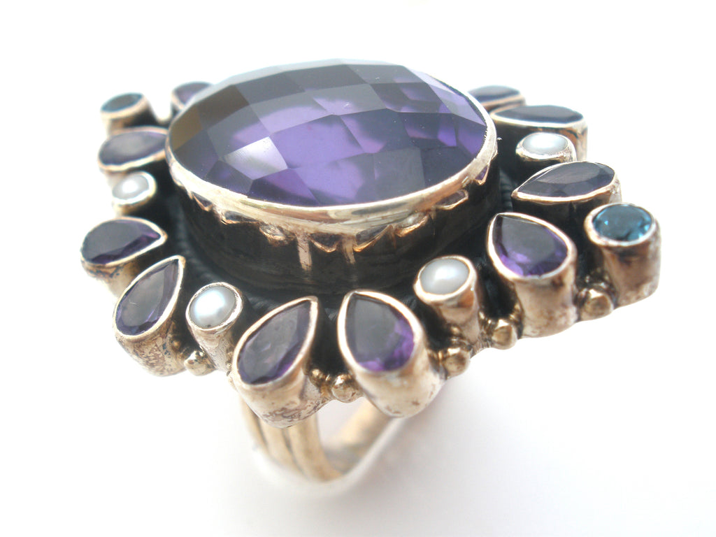 Designer Jewelry - This is a substantial sterling silver ring with amethyst gemstones accented with 2 small blue topaz and 6 small pearls.