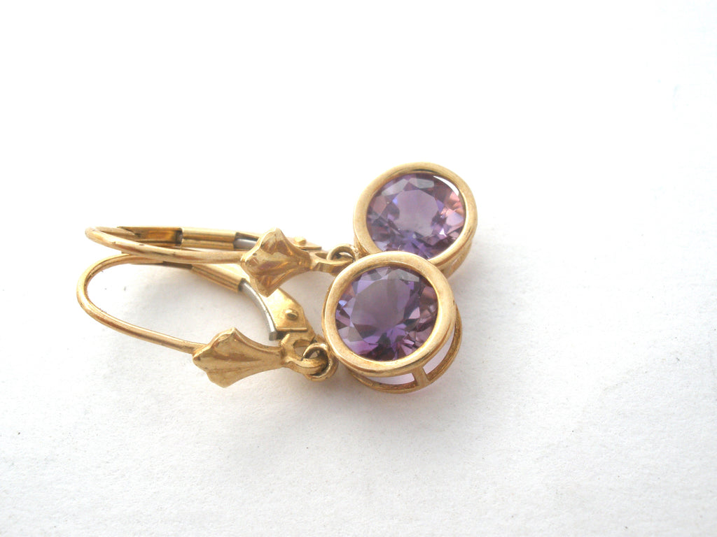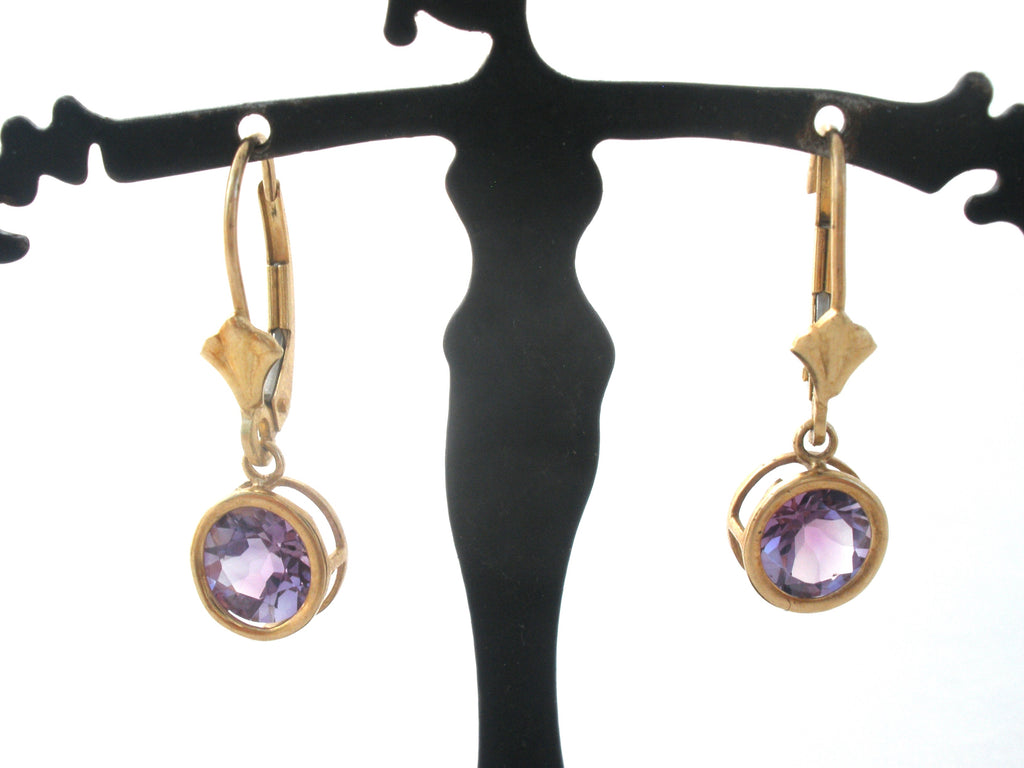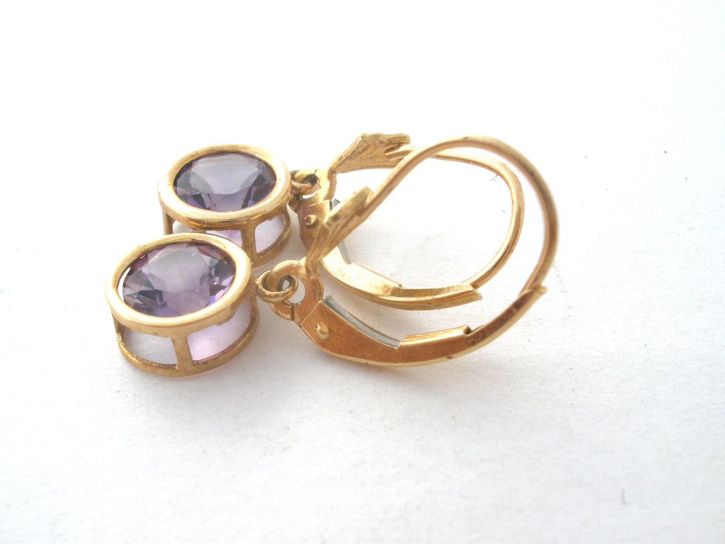Gemstone Jewelry - This is a pair of 10K yellow gold lever back dangle drop pierced earrings with round amethyst gems.