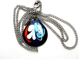 Hand Painted Vintage Jewelry - This is a tear drop shaped enameled copper pendant in colors of red, blue and white. It comes on a silver tone chain that is 18 inches