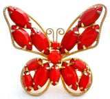 Figural Jewelry - This is a gold tone vintage butterfly brooch with prong set red rhinestones by D & E for Juliana.